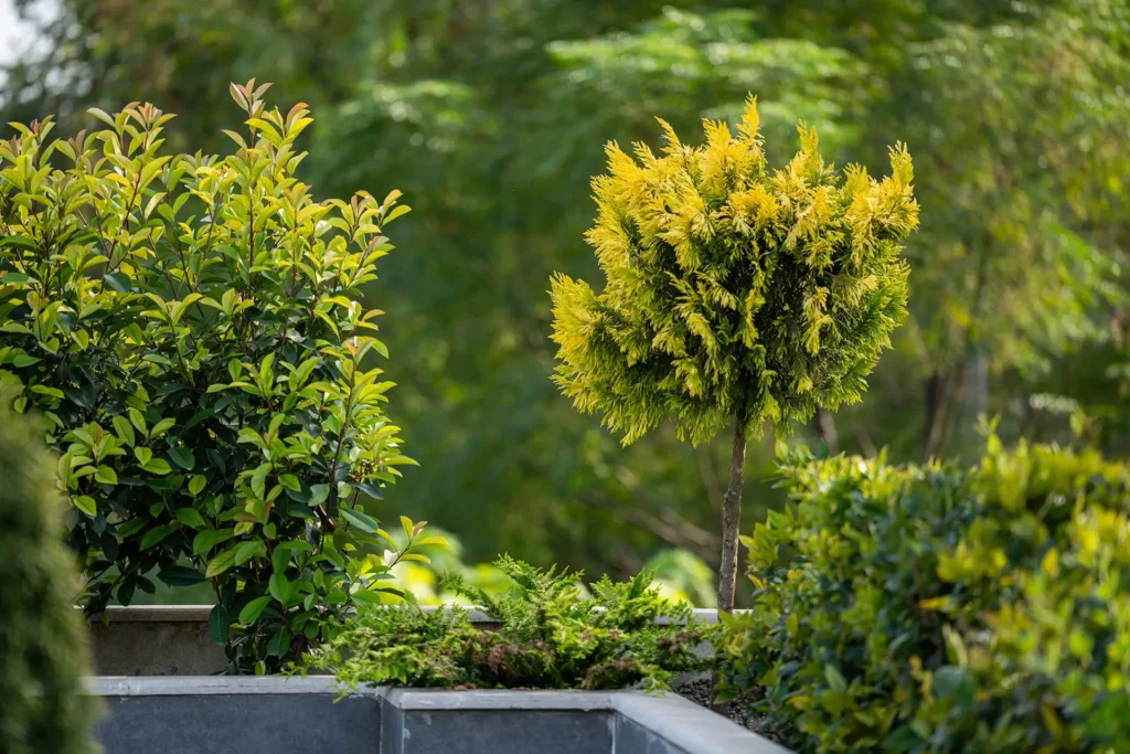 A corporate HQ landscape enriched with unique flowers and greenery.