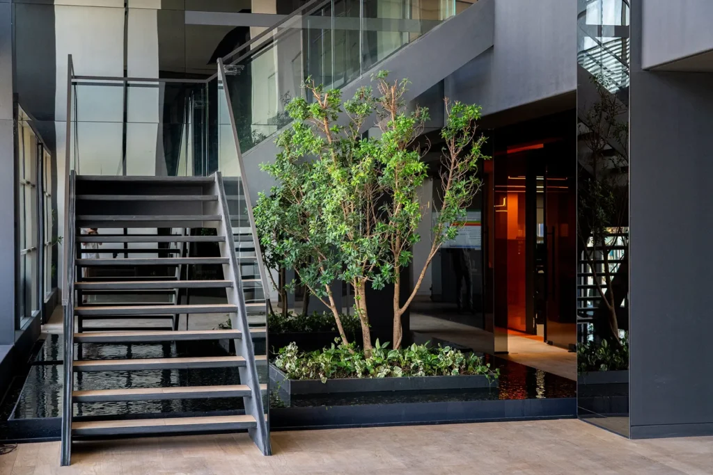 For Venus Glass headquarters, our botanical design created an inspiring corporate environment. We incorporated greenery into the office in a subtle yet impactful way, choosing plants that complemented the modern glass architecture while softening the corporate atmosphere.